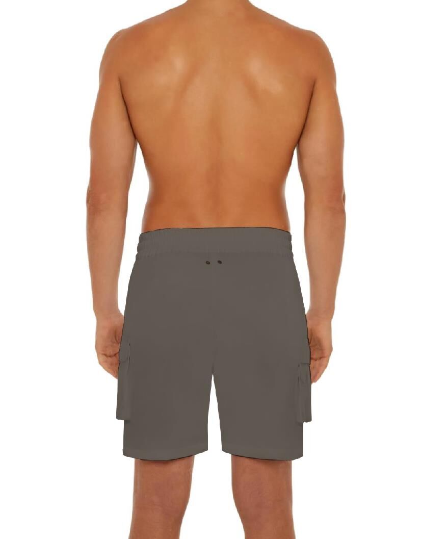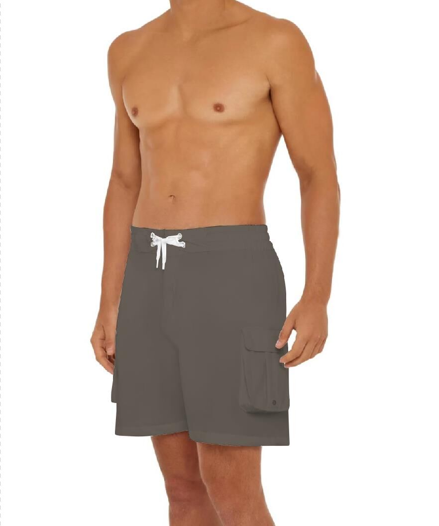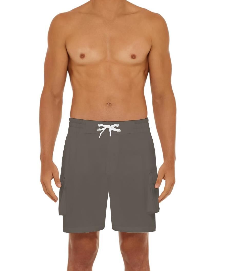 Fashion wholesale custom mens gray swim shorts with two big side pockets white draw string.